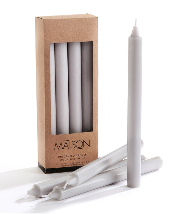 Create warm ambiance and an inviting atmosphere in your home with this taper candle crafted with a smooth finish. Burn time approximately 12 hours. Box: 10x2.8x1.8. Made in Vietnam. Paraffin Wax.