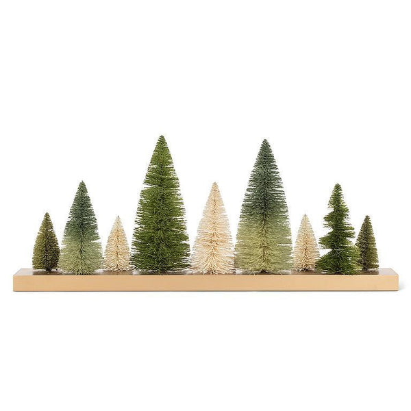 Get any space into the holiday spirit with the help of this Long Bottle Brush Tree Scene. Crafted out of wood and sisal, this minimalist piece features a unique arrangement of brush trees in various sizes and shades of gold, brown and green sitting on a solid wooden base for a contemporary complement to all your holiday decor.