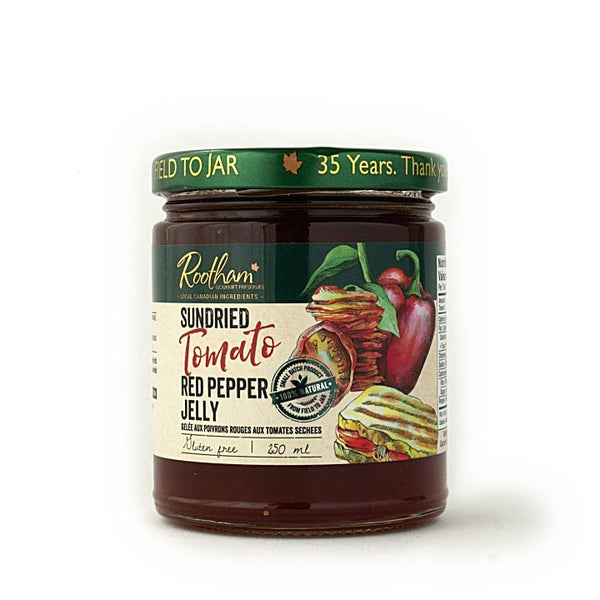 Our famous red pepper jelly with no heat and addition of sun-dried tomatoes