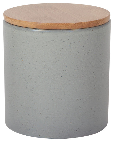 • Stoneware Canister: These modern stoneware canisters feature a variegated speckle sandstone surfaceÑthe result of a reactive glaze technique. Bamboo lid with silicone seal. Dishwasher safe (Not lid)