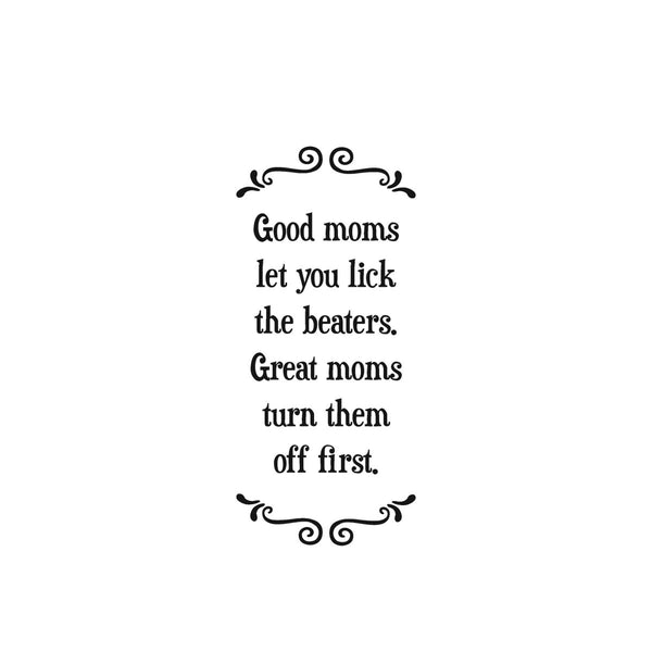 100% Cotton flour sack towel with black and white text: Good moms let you lick the beaters. Great moms turn them off first.
