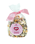 Our gourmet Pop Sensation drenched in Couverture chocolate sprinkled with LOVE! Enjoy this crunchy caramel popcorn covered in dark and white chocolate with a lovely mixture of pretzels, mini sugar pink heart sprinkles, and white mini pearls.