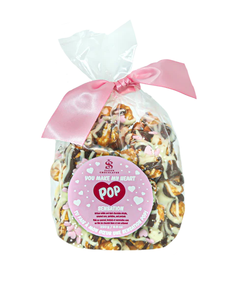 Saxon Chocolate You Make My Heart Pop Sensation Our gourmet Pop Sensation drenched in Couverture chocolate sprinkled with LOVE! Enjoy this crunchy caramel popcorn covered in dark and white chocolate...