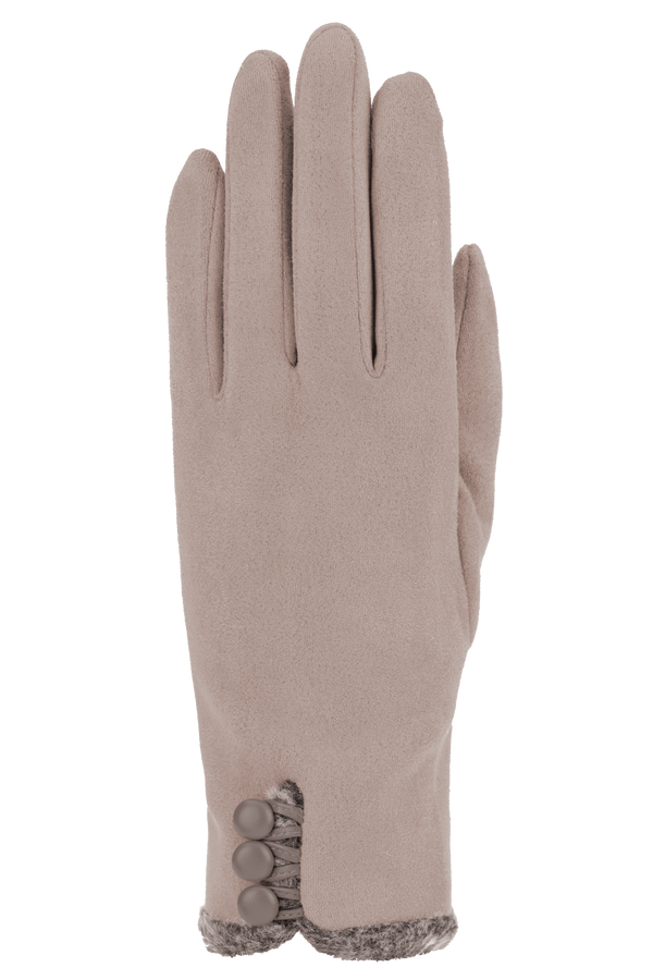 The Aria glove is made of faux suede, polyester and Spandex. This style is self-lined, it has faux-fur at hem top, decorative buttons and a center vent on the back of the hand!