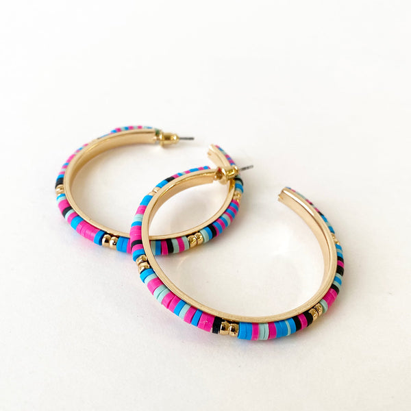 Colors & Gold Hoops HOOPS WITH METAL & POLYMER CLAY BEADS ON POSTS - MIX COLORS & GOLD - 2''