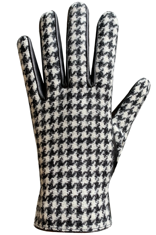 Peyton glove FEATURESHarris tweed woolSheepskin leather on palm andfourchettesInseam constructionPolyester liningIndex and thumb texting tipsLeather binding cuff