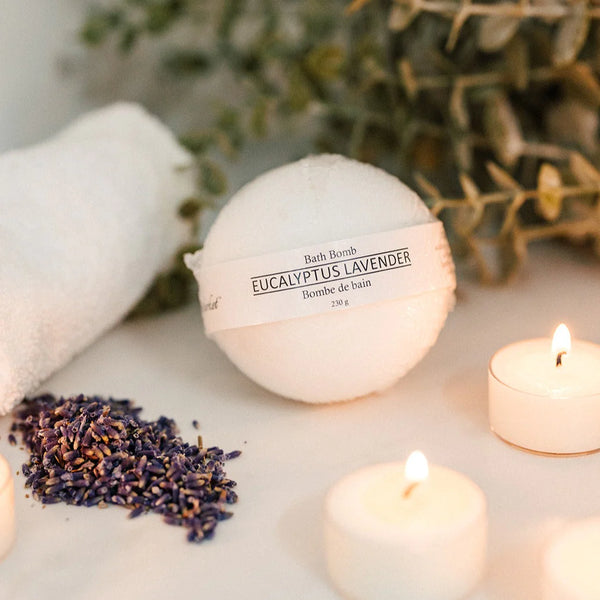 Eucalyptus Lavender Bath Bomb EUCALYPTUS LAVENDER- a calming blend of florals used for relaxation. Each bath bomb is 230g and made with an oil fragrance that is Phthalate and Paraben FREE....